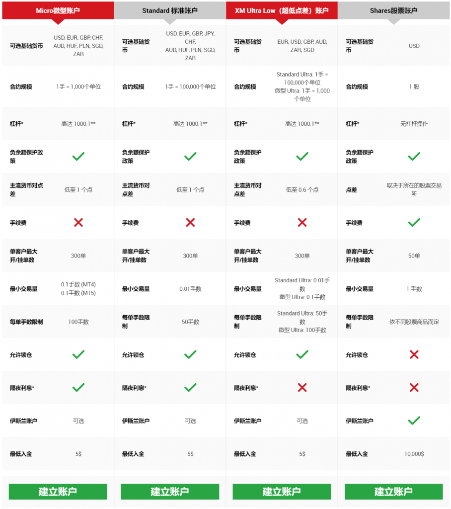 如上列图表所示,您在 XM 可以注册Micro(微型)、Standard(标准)或XM Ultra Low(超低点差) 三种类型的外汇交易账户。